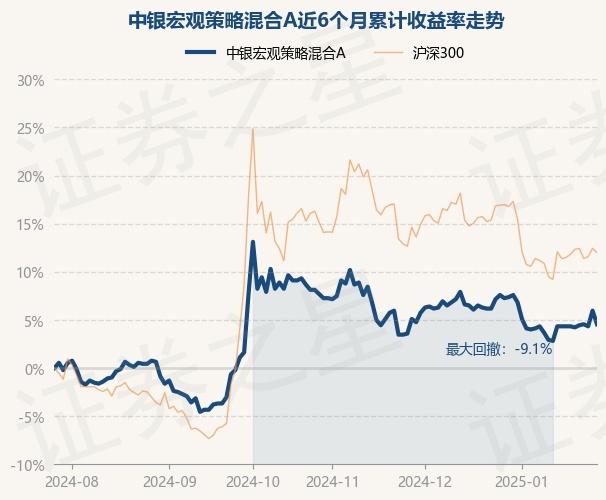 本站消息,1月27日,中银宏观策略混合A最新单位净值为0.965元,累计净值为0.965元,较前一交易日下跌1.33%。历史数据显示该基金近1个月下跌2.62%,近3个月下跌3.31%,近6个月上涨4.55%,近1年上涨8.18%。该基金近6个月的累计收益率走势如下图: