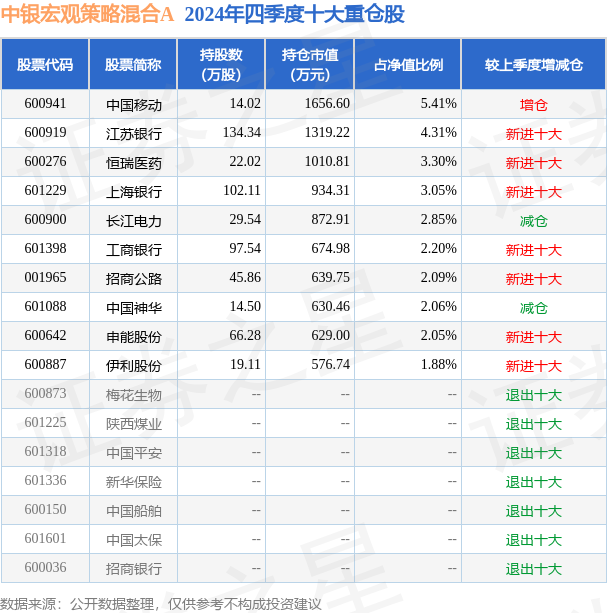 中银宏观策略混合A为混合型-灵活基金,根据最新一期基金季报显示,该基金资产配置:股票占净值比70.15%,债券占净值比5.38%,现金占净值比28.31%。基金十大重仓股如下: